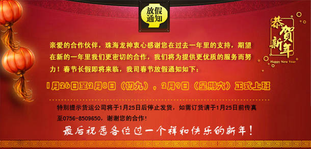 新年好!龍神祝您新年生意興??!我司已上班, 將繼續(xù)竭誠為您服務(wù),恭候您的惠臨及來電0756-8509651 、8509652、8509653