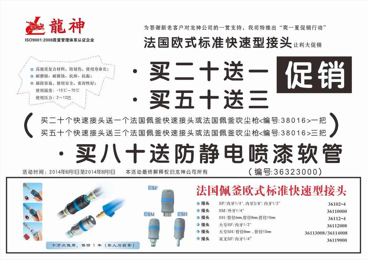 2、買五十送三(即買五十個(gè)快速接頭送三個(gè)法國佩釜快速接頭或法法國佩釜吹塵槍(編號(hào):38016)三把)