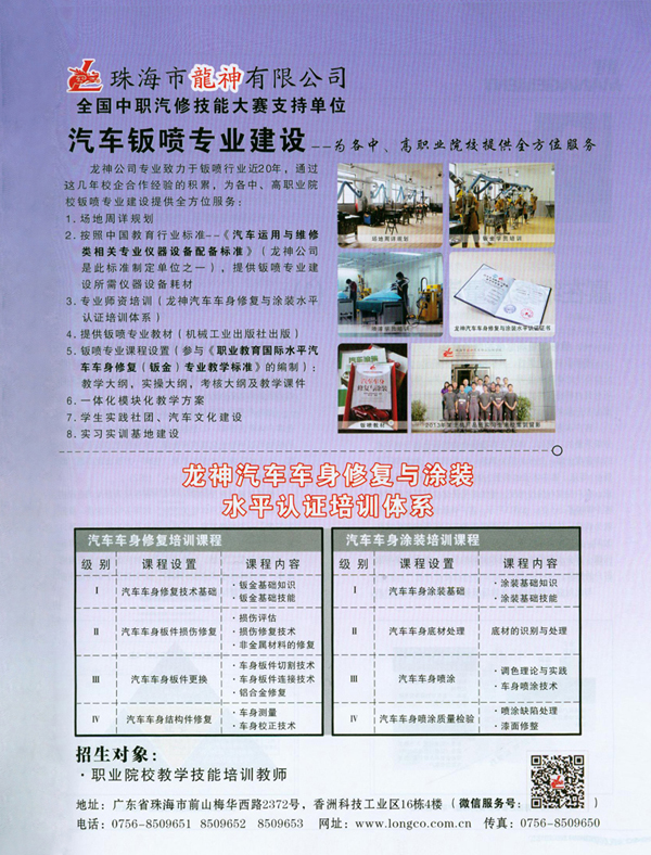 以珠海市龍神有限公司與廣東科學(xué)技術(shù)職業(yè)學(xué)院汽車車身修復(fù)專業(yè)校企合作為案例,通過教學(xué)模式設(shè)計(jì)、學(xué)科設(shè)置、場地規(guī)劃、實(shí)訓(xùn)設(shè)備配置標(biāo)準(zhǔn)、師資培訓(xùn)、教材選用以及學(xué)生就業(yè)渠道建設(shè)等多個(gè)方面進(jìn)行講解,全面輔助各交職院校進(jìn)行汽車車身修復(fù)專業(yè)建設(shè)。
